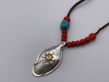 茶色のヒモにホワイトハーツ、そして差し色でターコイズをいれることで